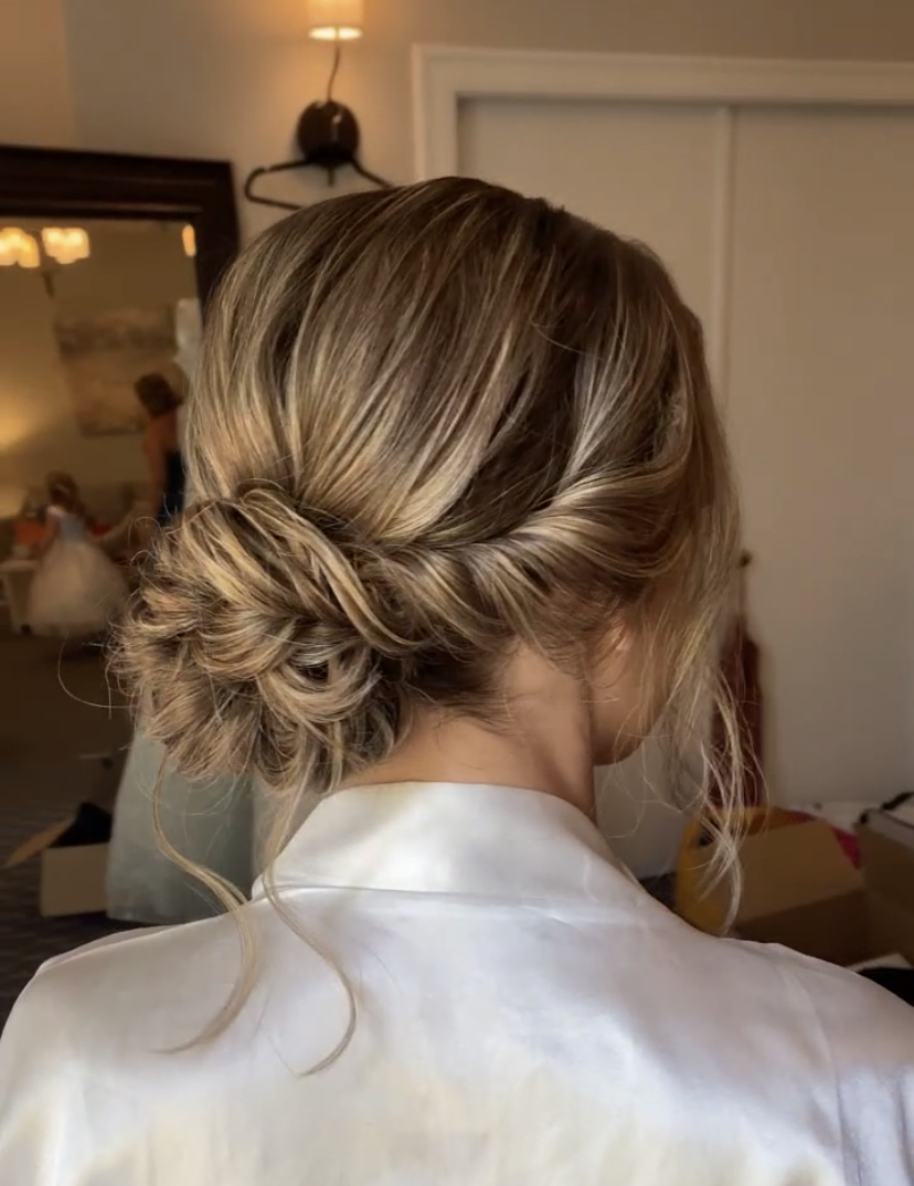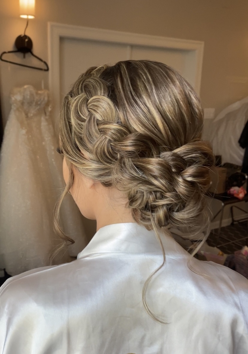 When I first did Mckenzie’s trial run for her boho style, she had incredibly long hair down to her butt. We did a super cute and flowy updo with a braid. After the trial she ended up cutting 10 inches off of her hair. After talking about it we decided to do the same style just a smaller version of it since she had less hair to work with. It turned out so beautiful and the braided updo looked so good with the color and dimension in her hair!